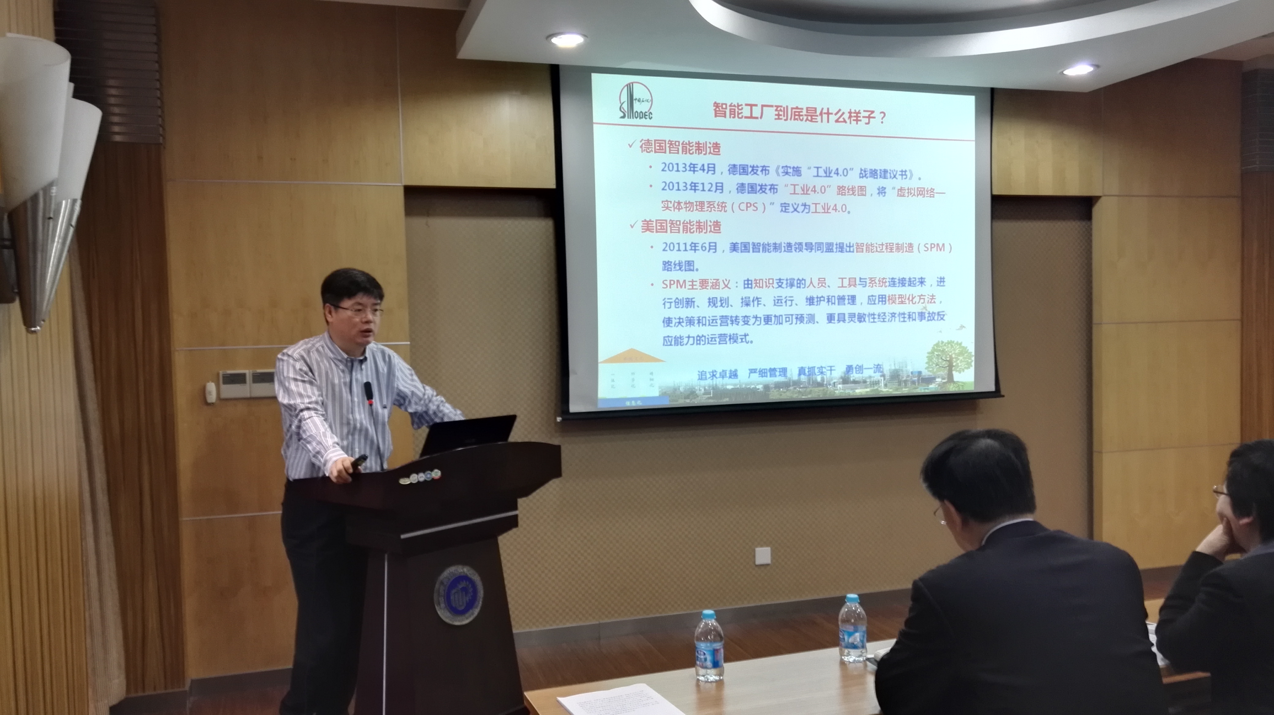 在报告会上,覃伟中博士首先介绍了国内外石油化工行业面临的机遇与挑战,分析了国内外推进信息化战略和信息化技术发展情况,深入报告了九江石化推进两化深度融合—智能工厂建设实践整体效果,以及信息物理空间、全流程优化、大数据应用等内容建设详细情况。最后,在线展示了九江石化三维数字化炼厂建设成果。老师和同学们认真聆听了报告内容,并与覃博士的技术团队进行了深入交流和探讨。报告结束后,覃伟中一行访问了“化工过程先进控制和优化技术”教育部重点实验室,杜文丽教授详细介绍了建设智能工厂等方面取得的进展。