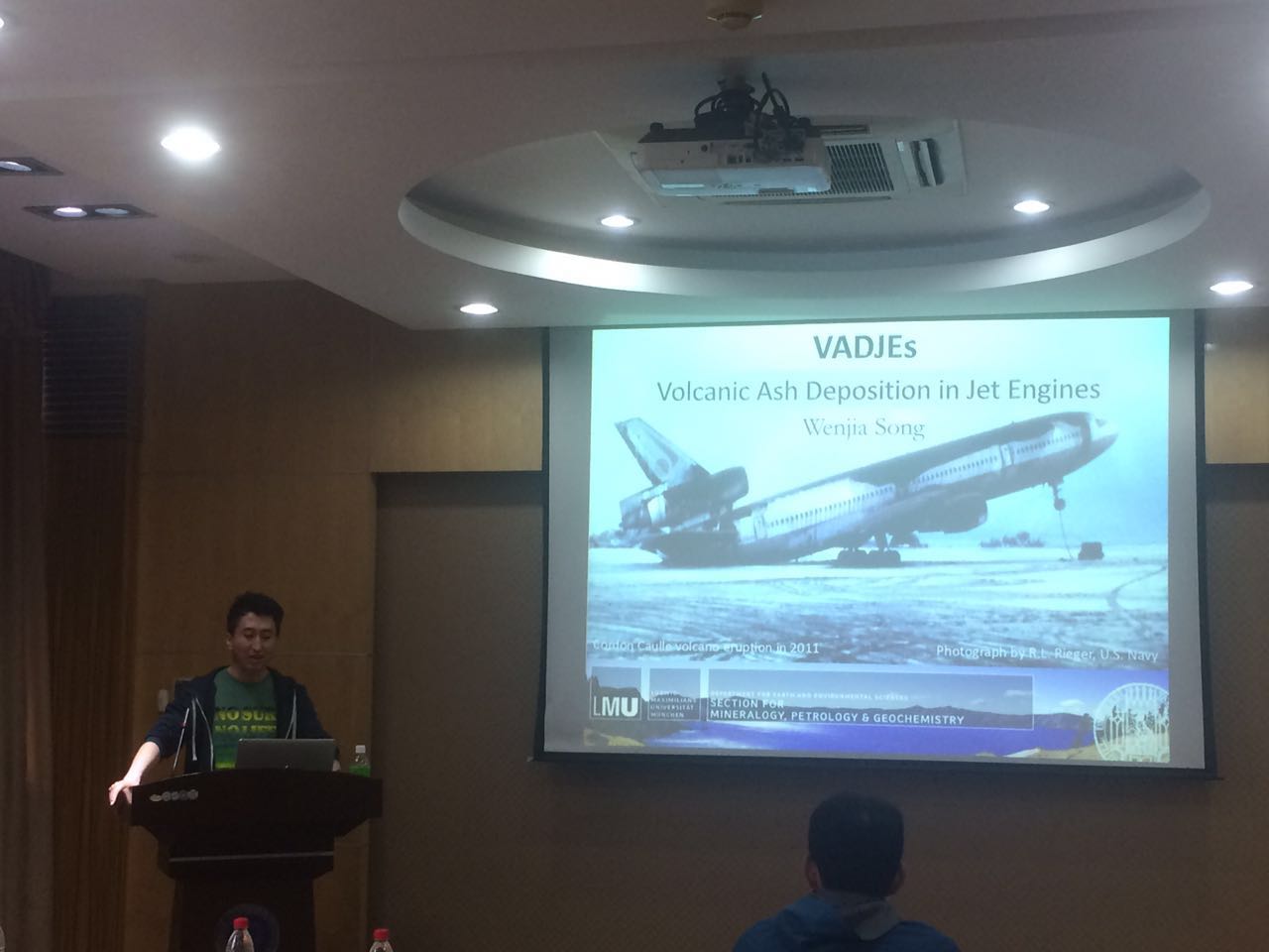 宋文佳博士给师生们介绍了火山灰对发动机的危害,细致的讲解了火山灰的成分和灰熔性的四个特征温度,创新性的提出了一种具有“自清洁”功能的保护涂层,在飞机发动机上具有广阔的应用前景,引起了师生们广泛讨论和积极提问。
