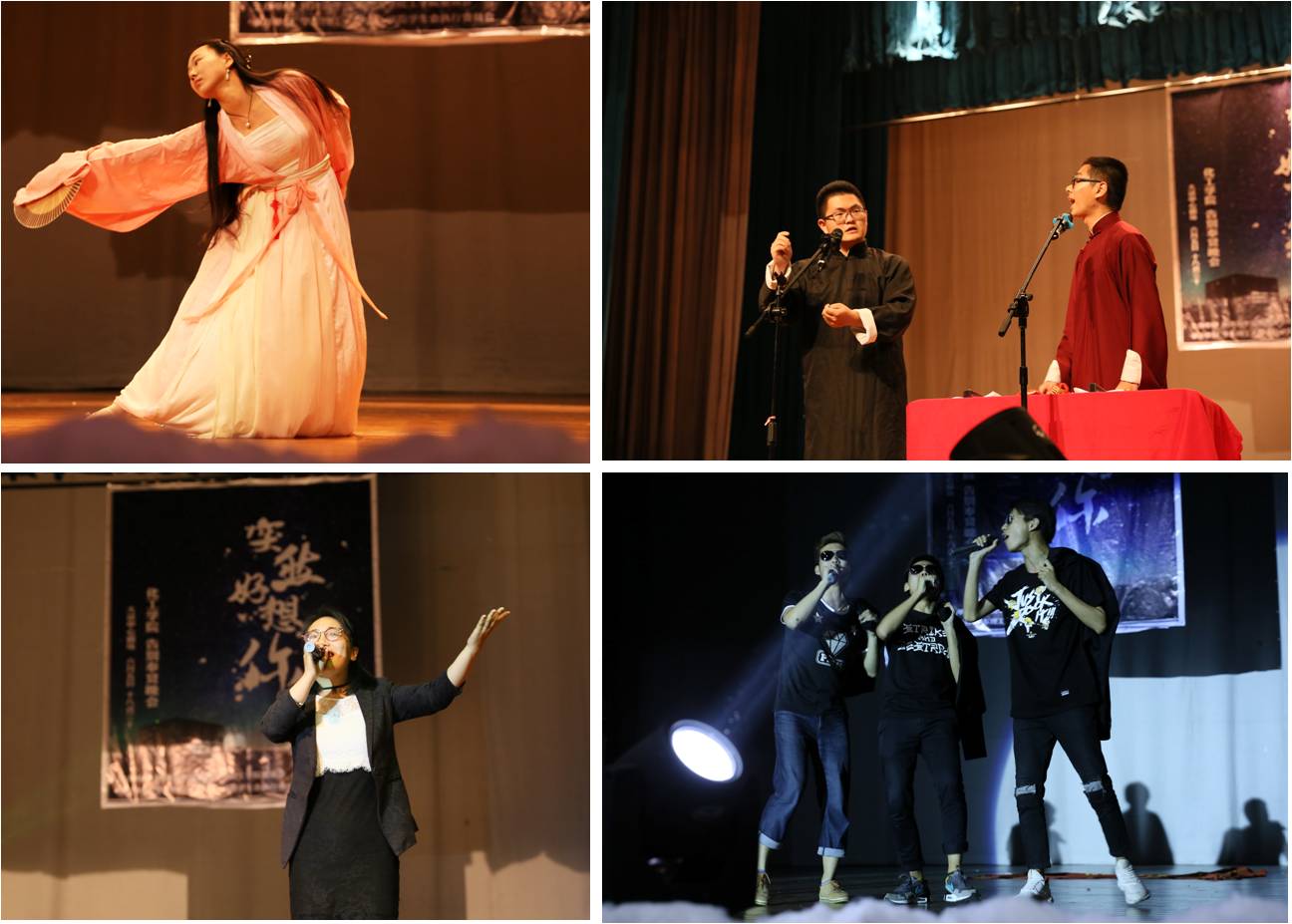 此次晚会的节目形式多样。晚会开场,乐队便以一曲《突然好想你》和《将军令》点燃了全场,汉服社带来的古典舞优雅而绚丽,3位歌手带来的歌曲串烧和艺术团的合唱则在激情活力中流露出依依惜别之情,魔术《阴晴圆缺》令人捉摸不透,夺人眼球。其间,精彩纷呈的话剧《30米的距离有多远》和相声《夜行记》引得全场忍俊不禁,让大家感怀起大学匆匆流去的时光。每个节目表演完,表演者表达了对奉贤和过去三年的留念,他们的真情流露令台下的观众也感慨不已。