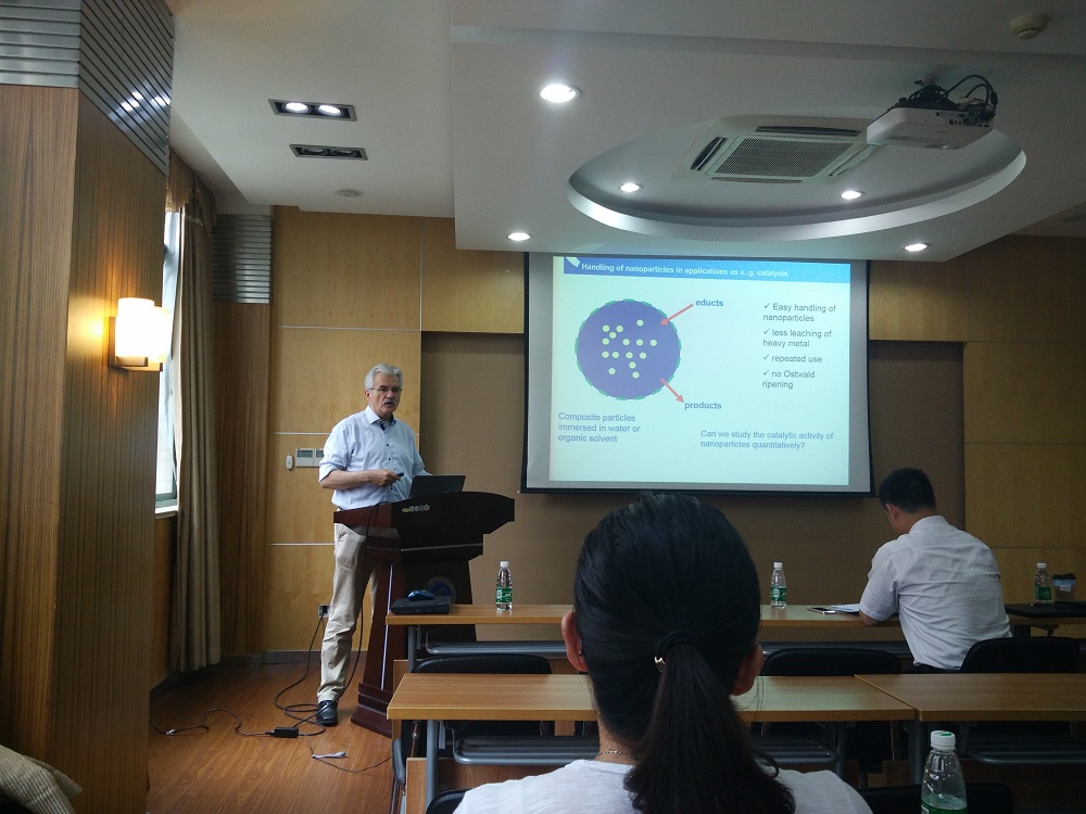 应郭旭虹教授的邀请,德国德国亥姆赫兹研究所柏林中心主任兼洪堡大学教授Matthias Ballauff和波兹坦大学Yan Lu副教授最近来到我校进行了学术交流。6月15日他们并分别为我校师生作了题为“Catalysis by metallic and oxidic nanoparticles in aqueous solutions: Model Reactions”,以及题为“Thermosensitive Microgels as active nanoreactors for tuning the catalytic activity of metal/metal oxide nanoparticles”的报告,为我校师生介绍了他们在大分子组装、金属催化、蛋白质吸附分离、纳米反应器等前沿领域的研究进展。