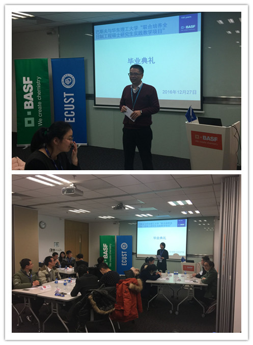 12月27日下午,2016年巴斯夫(中国)有限公司-华东理工大学联合培养全日制工程硕士研究生实践教学项目毕业典礼在巴斯夫(中国)有限公司总部召开。