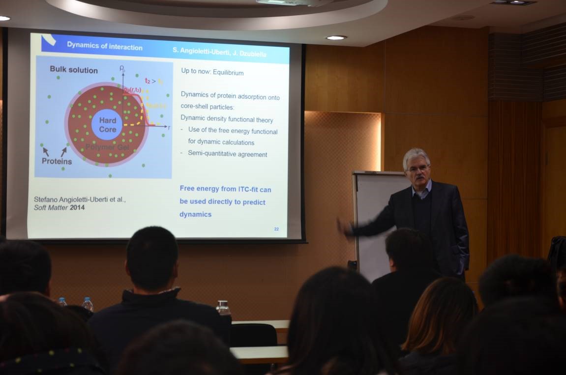 师生带来题为“Self-assembly of Proteins with Charged Polymers: Comparing experimental Data to Theory and Simulation”的学术报告(图1)。他的报告主要是关于聚电解质刷与蛋白质的相互作用,通过理论分析和计算机模拟,进一步加深了对其相互作用机理的理解。Ballauff教授丰富的知识和深入浅出的介绍,使我校师生受益匪浅。