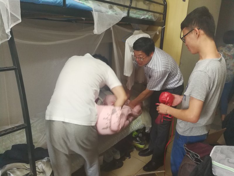 随后,朱学栋老师一行走访了11号男生宿舍,亲切关心学生的日常生活,鼓励学生搬到徐汇校区后以崭新的面貌迎接就业季、毕业季的到来。朱学栋老师亲自向学生示范卷被子的技巧,手把手、心连心,让学生感受到了学院对学生的深切关爱和殷切期盼。高艺霞老师对干净整洁的退伍学生寝室进行了高度赞扬,要求同学向他们学习,鼓励学生在锻炼中成长,养成良好的行为习惯,给低年级学生起到模范带头作用。