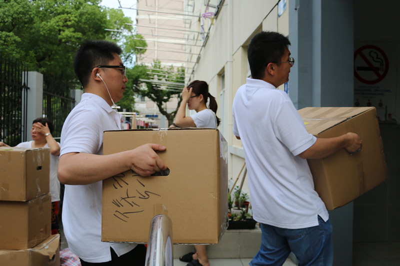 ”字样的文化衫的志愿者们和老师热情饱满,早早地就站在大草坪上毛主席塑像背后和五舍旁期待着载有学弟学妹的大巴车和装有行李的大卡车的到来,做好了志愿服务的准备。等到大卡车将行李运到四食堂旁,义务搬运的师傅们卸载并用三轮车运到五舍楼下后,党员志愿者们就争先帮忙将其一件一件地搬运到相应的宿舍。搬运过程中,大家都很积极,也很细致小心以防搬错宿舍,弄坏物件。很快,在现场师生的共同努力下,此次本科生宿舍搬迁工作顺利完成,志愿服务活动取得圆满成功。
