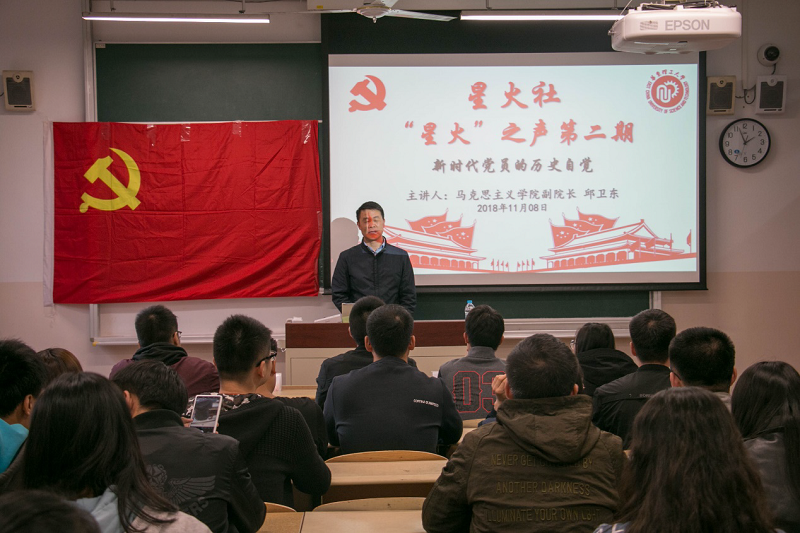 仪式结束后,学院即启动了新任学生支部骨干的培训,暨“星火”之声第二期活动,特邀嘉宾马克思主义学院副院长邱卫东带来题为《新时代党员的历史自觉》的辅导报告。