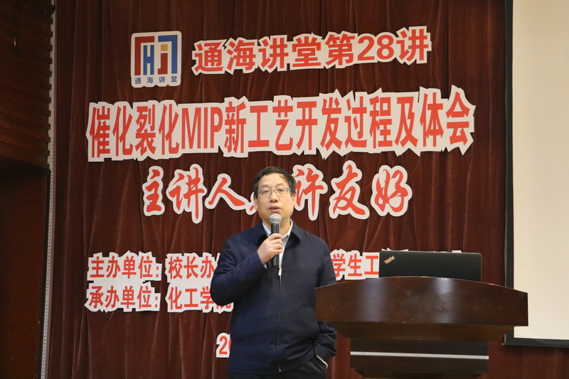 承办的第28期“通海讲堂”高端学术讲座在奉贤校区通海厅举行。我校杰出校友、中石化集团公司石油炼制领域首席专家许友好教授应邀带来了题为“催化裂化MIP新工艺的开发过程及体会”的专题讲座。