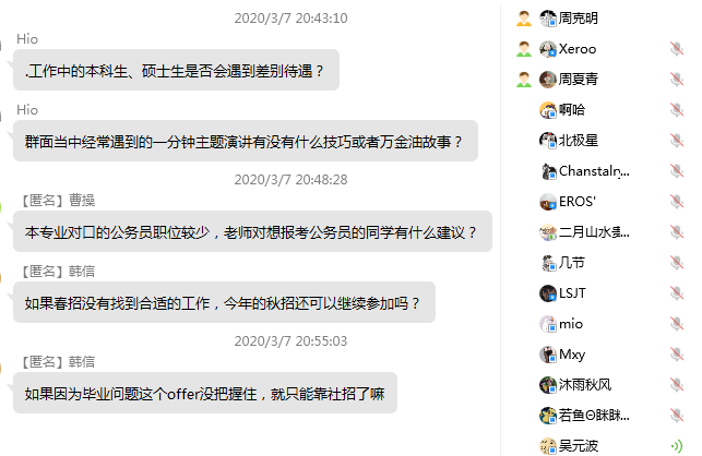 强引导,加强线上就业服务指导。学院分专业邀请杰出校友分享工作经历,针对不同专业学生的差异性需求,分享求职就业经验,帮助学生答疑解惑,学生可选择匿名提问,即增加互动趣味性,又保护个人隐私。现已邀请到徐龙宇、吴元波、周夏青等校友在线分享,以校友精神为激励,拓宽学生视野,助力学生就业,强化求职能力,提升就业自信。交流结束后,学生骨干主动整理归纳,帮助同学复盘总结。