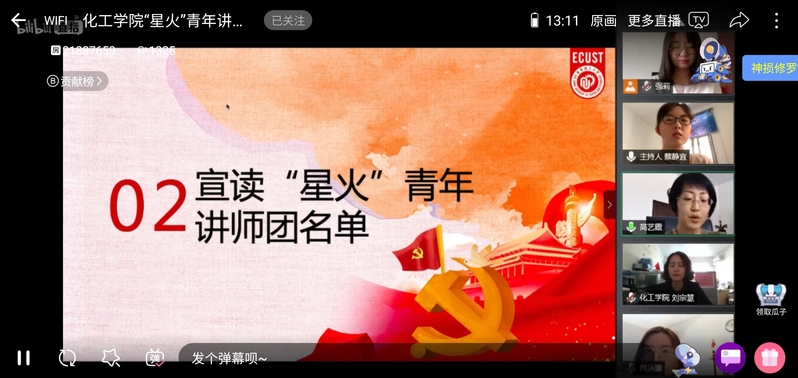 党委副书记高艺霞出席会议,全体辅导员、“星火”青年讲师团成员、全体学生党员、入党积极分子以及团员青年通过腾讯会议、化工青年集结地站直播平台参加活动。本次活动由星火社社长蔡静宜主持,直播人气达3000余人次。