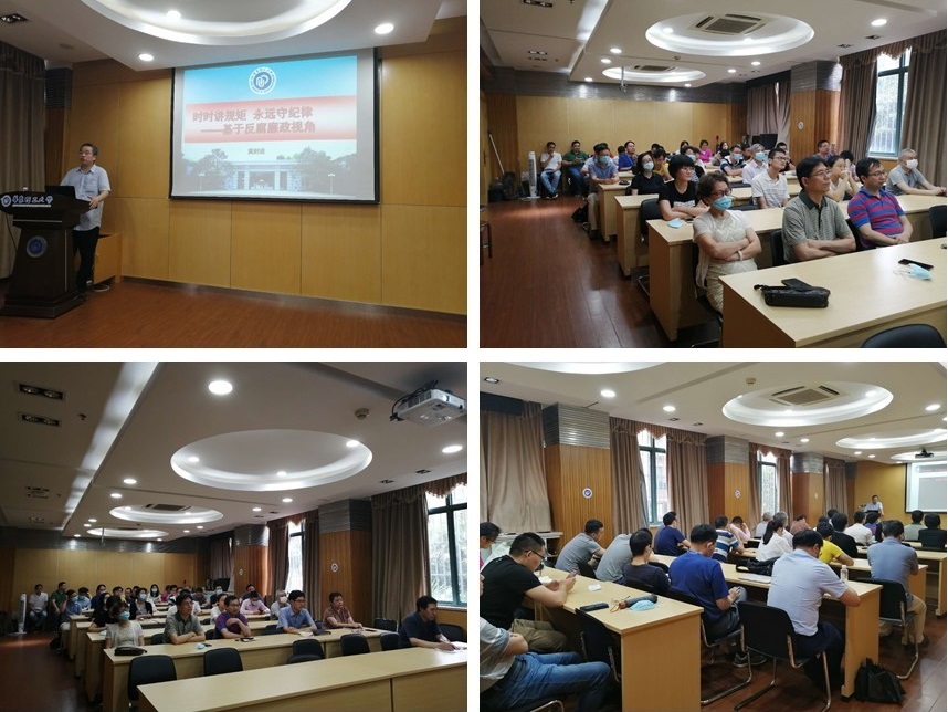 在此次组织活动中,黄时进教授首先引用习近平总书记“全面从严治党永远在路上。一个政党,一个政权,其前途命运取决于人心向背。全面从严治党依然任重道远”展开讲述。其中,具体讲述了如下四方面的内容:为何要加强党风廉政建设及守规矩、讲纪律;不守规矩、不讲纪律必然最终导致渎职和腐败;党的十八大以来反腐斗争的巨大成果及新的挑战;守纪律、讲规矩、主动适应全面从严治党新常态。并结合具体案例,对当下的腐败行为进行了深入分析,也使我们深深感受“时时讲规矩,永远守纪律”必须从每一个普通党员做起,从每一个基层党支部做起。