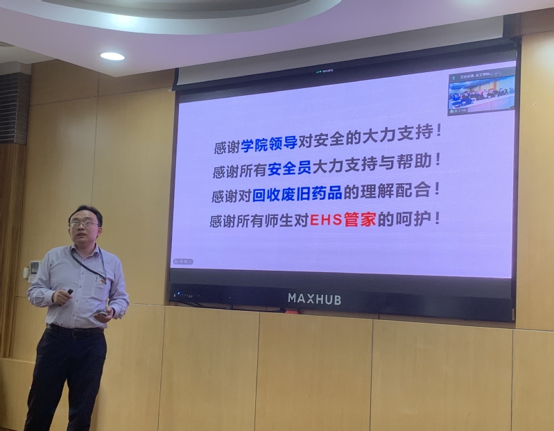 徐宏勇强调,安全是立身之本。他首先回顾了三年来我校发生的实验室安全事故,以事故案例开展警示教育,为参会师生党员敲响安全警钟。针对化学化工学科气瓶和溶剂需求量大、分布区域广等特点,他主张依托HSE管家服务系统,通过开展危化品分类存储、建立安全培训矩阵、加强个人防护等项目守护师生健康安全,筑牢实验室安全屏障,切实提升实验室安全管理水平。