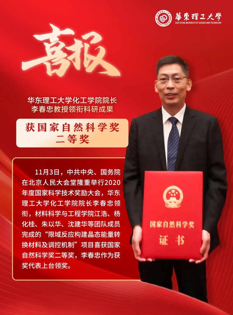 院长李春忠教授领衔,材料科学与工程学院江浩、杨化桂、朱以华、沈建华等团队成员完成的“限域反应构建晶态能量转换材料及调控机制”科研成果喜获国家自然科学二等奖,李春忠作为获奖代表上台领奖。