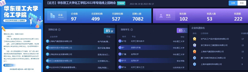 2022年专场线上招聘会”,经过审查97家单位参与招聘,实现了就业招聘的空中宣讲、即时互动和视频面试。同时,学院充分整合“华理就业领航号”以及教师、校友推荐的岗位资源进行有针对性的推送,确保就业信息传递畅通。疫情期间,学院累计推送就业信息500余次,提供岗位超过2000个,125名学生顺利完成线上签约。此外,学院进一步深化校企合作,积极参与“访企拓岗”专项行动,切实加强与重点单位重点沟通合作,拓宽毕业生就业渠道。