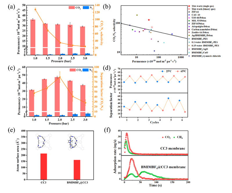 气体分离性能测试表明晶体重排显著提高了POC膜的气体分离选择性。膜性能超过了目前已报道的大多数分离膜,且POC膜表现出较好的长期和热冲击稳定性。进一步的表征和计算表明离子液体分子诱导表面晶体重排后修饰POC本征孔道,实现了POC本征孔的原位调控,阻止了N2等较大分子的进入,并通过石英晶体微天平测试验证了这一结论。该工作为制备具有规则通道的晶体重排膜提供了新的启发。