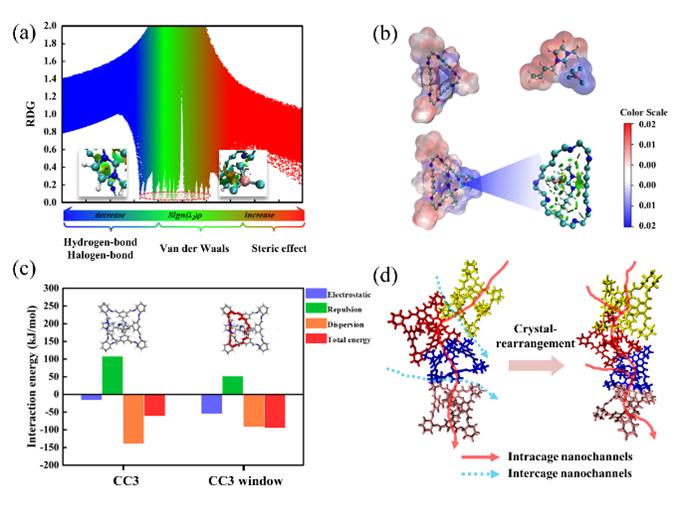密度泛函理论(DFT)表明POC和离子液体分子之间的相互作用以范德华力和少量氢键主导。POC分子的孔口显示静电负性,可以与离子液体分子的静电正部分结合。在膜表层诱导重排过程中,基于静电吸引效应,离子液体分子诱导静电负性POC窗口优先向外排列,与离子液体分子中的正电部分结合,使POC重排成紧密且规则有序的晶体薄层,消除了晶间间隙。