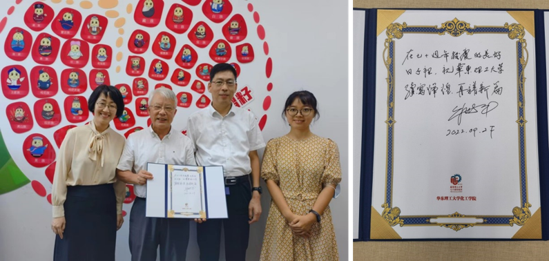 9月27日中午,朱世平院士专程前往奉贤校区E教116教室为华东理工大学书写校庆寄语,庆祝学校七十周年华诞,祝福华理续写辉煌,再谱新篇。