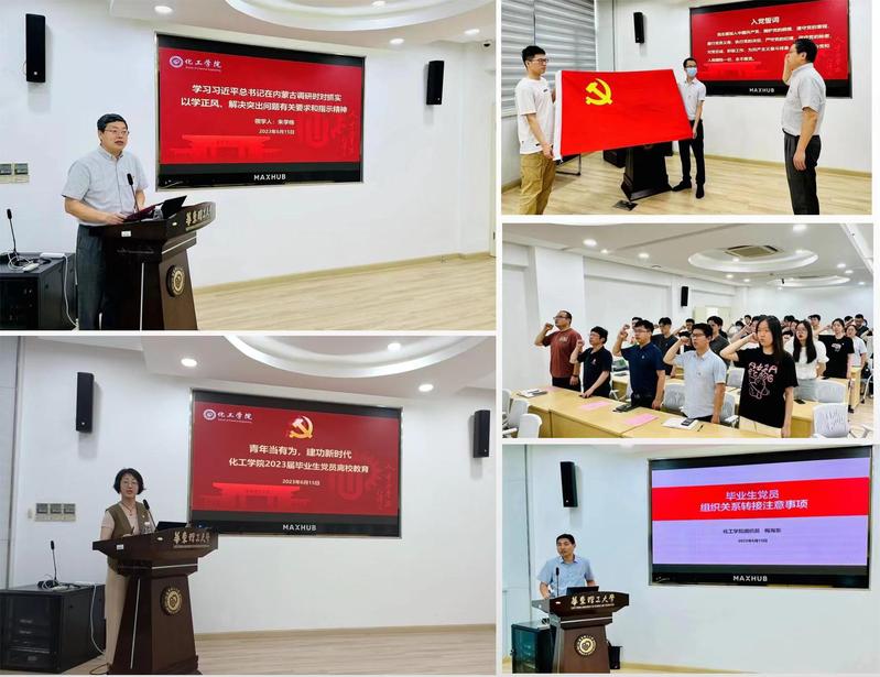 党委书记朱学栋带领全体党员,举起右手,紧握拳头,在党旗下宣誓,重温入党时的神圣和庄严,再悟初心。会上,朱学栋领学《习近平总书记在内蒙古调研时对抓实以学正风、解决突出问题的有关要求和指示精神》,从“大兴务实之风”“弘扬清廉之风”“养成俭朴之风”三个方面勉励全体毕业生党员要时刻牢记党员身份,在未来的学习与工作中既仰望星空,又脚踏实地,做一个求真、求是、求实的新时代好青年。学院党委副书记高艺霞围绕“科技报国、人才强国”寄语毕业生党员:牢记入党初心、常怀感恩之心、砥砺报国之志,用自己的学识和技术,解决国家发展中的“卡脖子”技术难题,以实际行动践行自己的初心使命。学院组织员梅海东就毕业生党员组织关系转接工作流程和注意事项进行了详细讲解,希望大家将及时做好组织关系转接作为增强党性观念的重要一环。