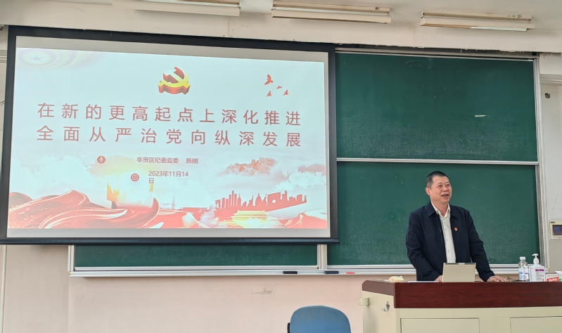 邀请奉贤区纪委常委、区纪委监委组织部部长陈刚为学院师生作廉洁教育专题报告,学院党政领导班子成员、全体教工、学生党支部纪检委员参加学习。报告由学院党委副书记兼纪委书记段学志主持。