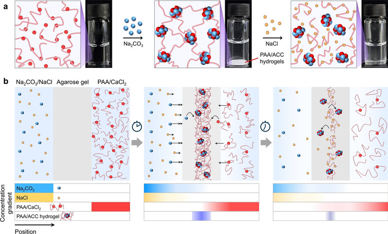 近日,我校郭旭虹教授团队提出了一种通过反应扩散控制动态超分子自组装的新策略,基于一类聚丙烯酸/无定型碳酸钙(PAA/ACC)超分子凝胶系统,成功实现了结构化超分子水凝胶的动态生长。该工作以“Dynamic growth of macroscopically structured supramolecular hydrogels through orchestrated reaction-diffusion”为题发表在Angew. Chem. Int. Ed.(Angew. Chem. Int. Ed. 2023, e202310162)上。