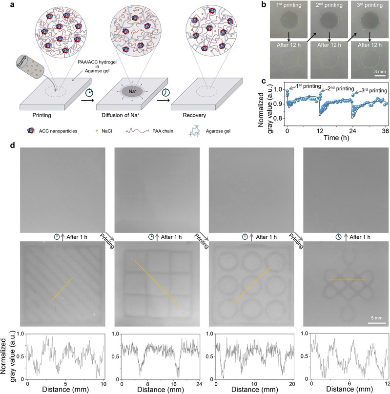 最后,基于该水凝胶的动态结构化特性,作者展示了一种类脑动态信息存储系统的概念性应用。如图2所示,将含有NaCl的图案化印章与PAA/ACC凝胶基底进行接触,NaCl扩散到接触区域,对PAA/ACC凝胶局部消解,将印章图案信息录入到凝胶基底中;随着NaCl向空白区域继续扩散,NaCl浓度降低,静电屏蔽作用减弱,解体的PAA/ACC凝胶重新组装,致使图案化信息消失,实现了图案信息的动态存储过程。此外,该存储系统具有良好的循环性,可在擦除后多次录入不同信息而不互相干扰。