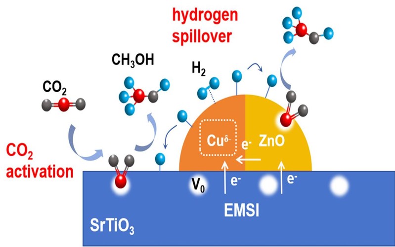 图片说明:金属与载体间电子转移EMSI效应,氧空位促进CO2活化,Cuδ-促进氢溢出