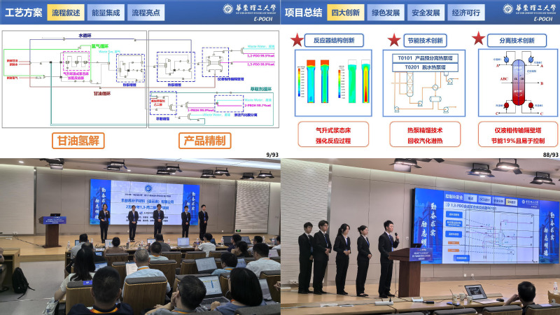 “E-POCH”队以某油脂厂副产甘油为原料,采用甘油氢解法设计了年产2万吨1,3-丙二醇项目。历经7个月,团队成员从项目可行性研究、工艺方案比选论证、流程搭建、设备设计及选型、自动控制、总图布置、车间布置、安全评价、经济分析等多个方面,对项目进行精心设计,具有高效生产、绿色环保、节能减排、安全可靠、经济可行的特点,符合中国制造2025的要求。“E-POCH”队的5位指导老师为沈荣春、黄子宾、吴艳阳、雷明、彭阳峰,另有袁佩青、李瑞江、魏永明、杨座国、杨敬一、宗原6位老师深度参与了竞赛指导。