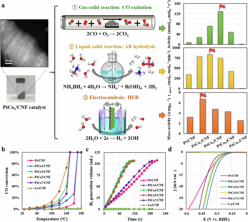 通过进一步探究活性位点稳定性和相关反应机理,揭示了不同界面位点间的协同作用,辨识了不同反应的主控活性位点:在CO氧化过程中,Pt-Co合金与相邻的Co3O4团簇不仅能降低Pt电子密度以弱化CO的吸附,还能提供丰富的晶格氧物种。在氨硼烷水解过程中,Pt-Co合金和外延CoOx覆盖层分别作为氨硼烷和水活化的活性位点,显著促进了氢气的生成。在HER反应过程中,Pt-Co合金可以避免外延CoOx或相邻Co3O4簇的空间位阻效应,其颗粒内的d轨道杂化可显著降低Pt的d带中心。这些协同效应的发现和主控活性位点催化性能的量化,为构建与传统的组分/尺寸依赖火山曲线不同的协同效应依赖火山曲线提供了可能,从而架起双金属催化中理论模型和实验观察之间的“桥梁”。