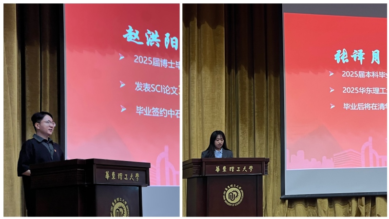 化学工程与技术专业博士生赵洪阳、机动学院智能制造工程专业本科生张译月作为毕业生党员代表发言。他们在校期间学业成绩优异,科研成果丰硕,多次参与国家级课题研究。同时,积极投身社会实践,组织公益活动,主动服务集体与社会,以全面的综合素质和强烈的社会责任感,展现了当代青年学子的使命与担当。