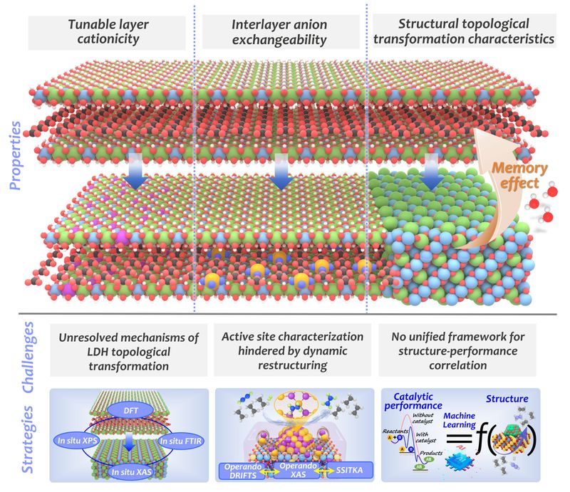 尽管基于LDHs构筑的多相催化剂在原子级精准催化中表现出显著优势,但仍面临反应条件下结构与中间体演化机制不明、构-效关系缺乏可推广模型,以及经验驱动设计制约高性能催化剂开发等挑战。未来研究需从材料合成、原位/工况条件表征、理论模拟及机器学习等多角度出发,系统揭示LDHs及其衍生结构的动态演化与活性位点生成机制,构建可推广的原子级构-效关系模型。通过多尺度模拟与高通量实验相结合,有望将催化剂设计由经验驱动转向预测驱动,加速高性能LDHs基催化剂的筛选与创制。在应用前景方面,LDHs衍生催化剂在光、电、热催化及绿色能源转化器件中具有很大潜力,其固有的层状结构、组分高度可调特性及强金属-载体相互作用,有望推动其在可持续能源转化(如绿色燃料合成)与高端化学品合成领域中的广泛应用。